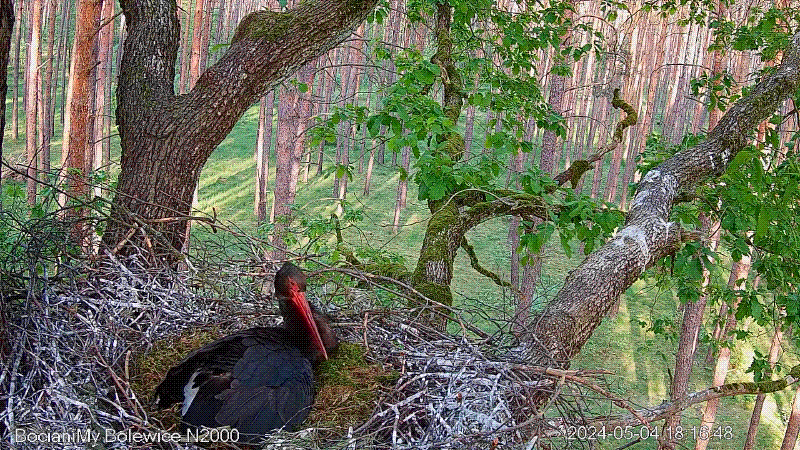 What's happening in Bolewice! Yesterday, Królewicz chased away a raccoon, and today, Skierka chased away a hawk (Accipiter gentilis) in beautiful style. Of course, we understand that this is a hawkish nature, but... we are not happy about his presence. This is a bird still in a brown juvenile coat (2nd), with vertical stripes on the chest. We hope that he will not come back here, because we are WAITING for the first little stork to hatch. Today is the 36th day since the first egg was laid and hatched. According to our calculations, Skierka's first chicks hatched: 2021 - on the 35th day, 2022 - on the 36th day, 2023 - on the 34th day. So… it's time, it's time